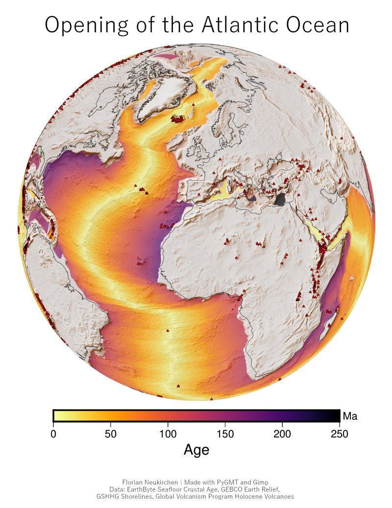 A geological timeline showing how the Atlantic sea floor has spread over millions of years, with active volcanoes marking the boundaries.