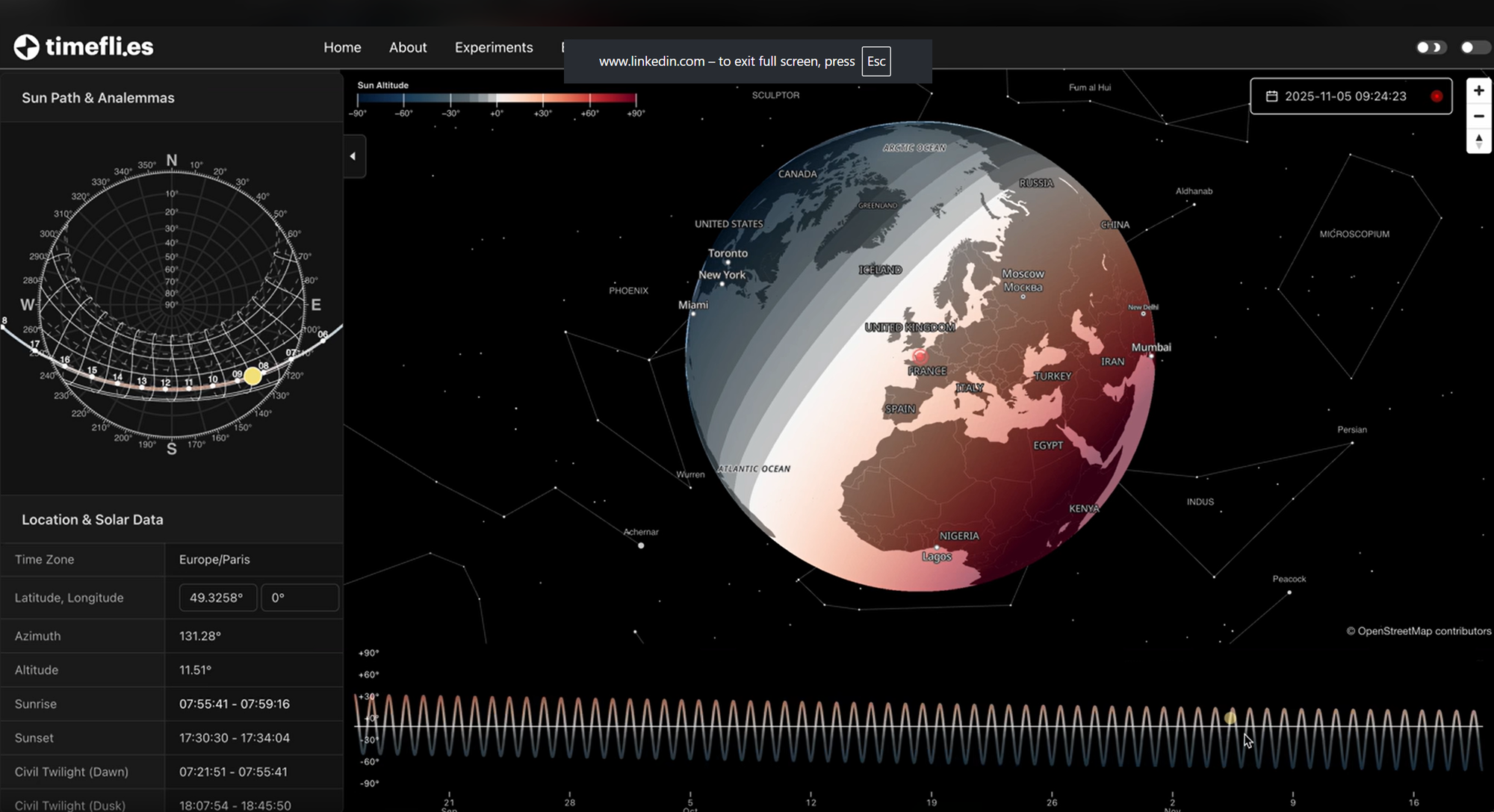 An interactive globe showing Earth's relationship with the Sun, Moon, and stars - visualising daylight, night, and twilight zones throughout history.