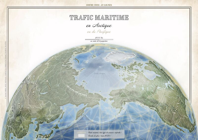 Stunning orthographic projection showing shipping lines in the Arctic Pacific region, with beautiful cartographic styling.