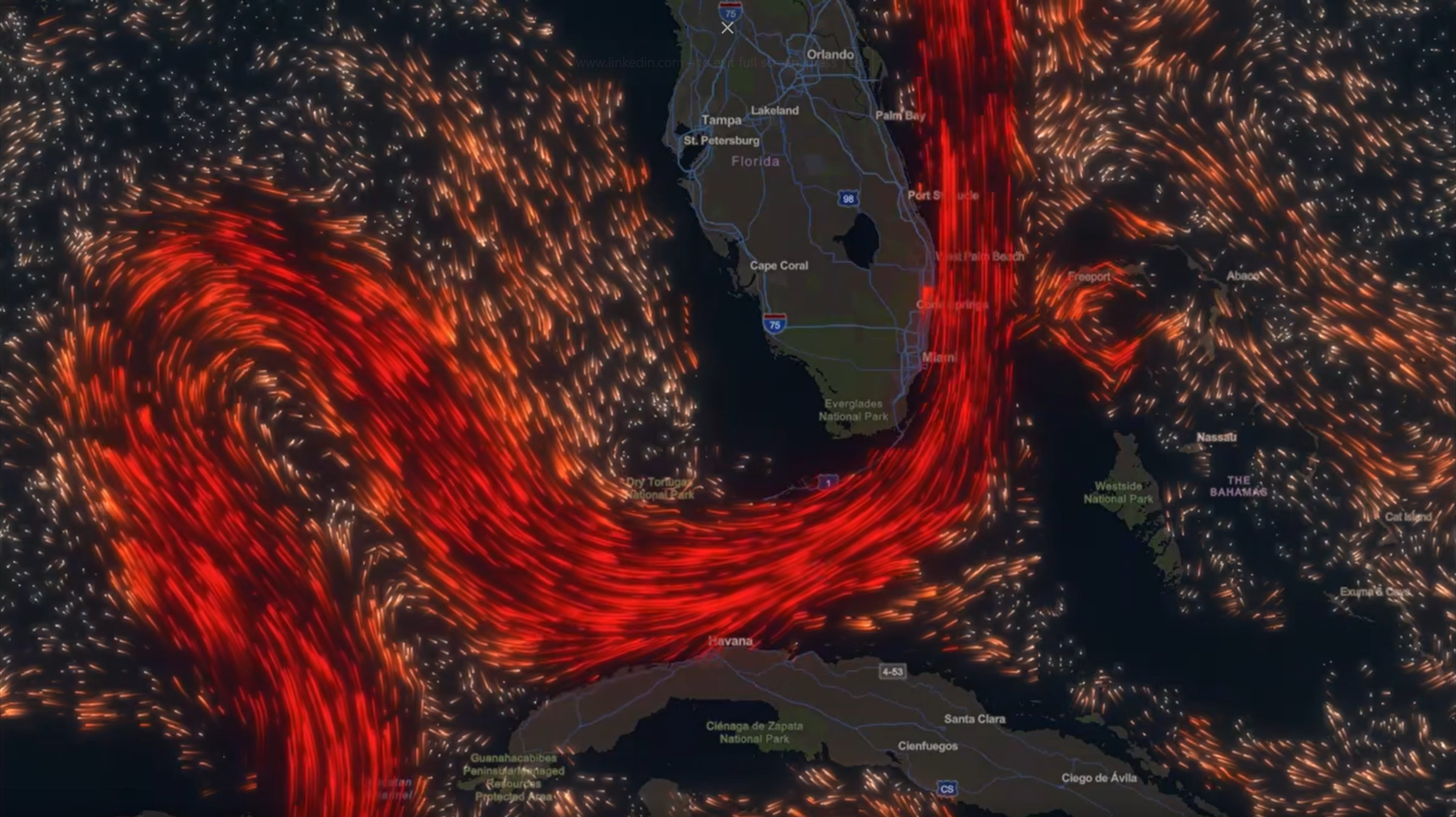 Hypnotic flow lines depicting ocean surface currents around Florida and the Gulf of Mexico, using an eye-catching red colour scheme.