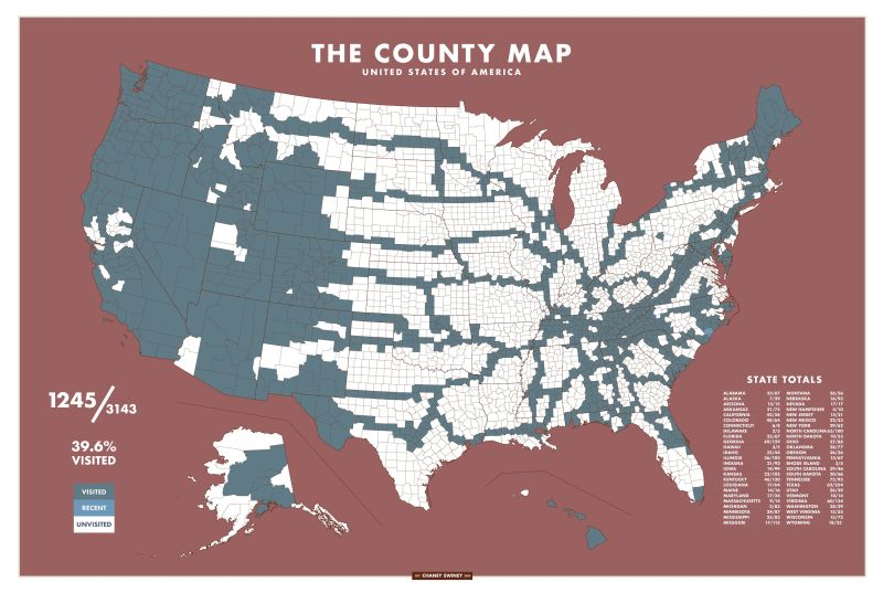 A lifelong cartographic quest to map every US county visited - currently at 40% completion.